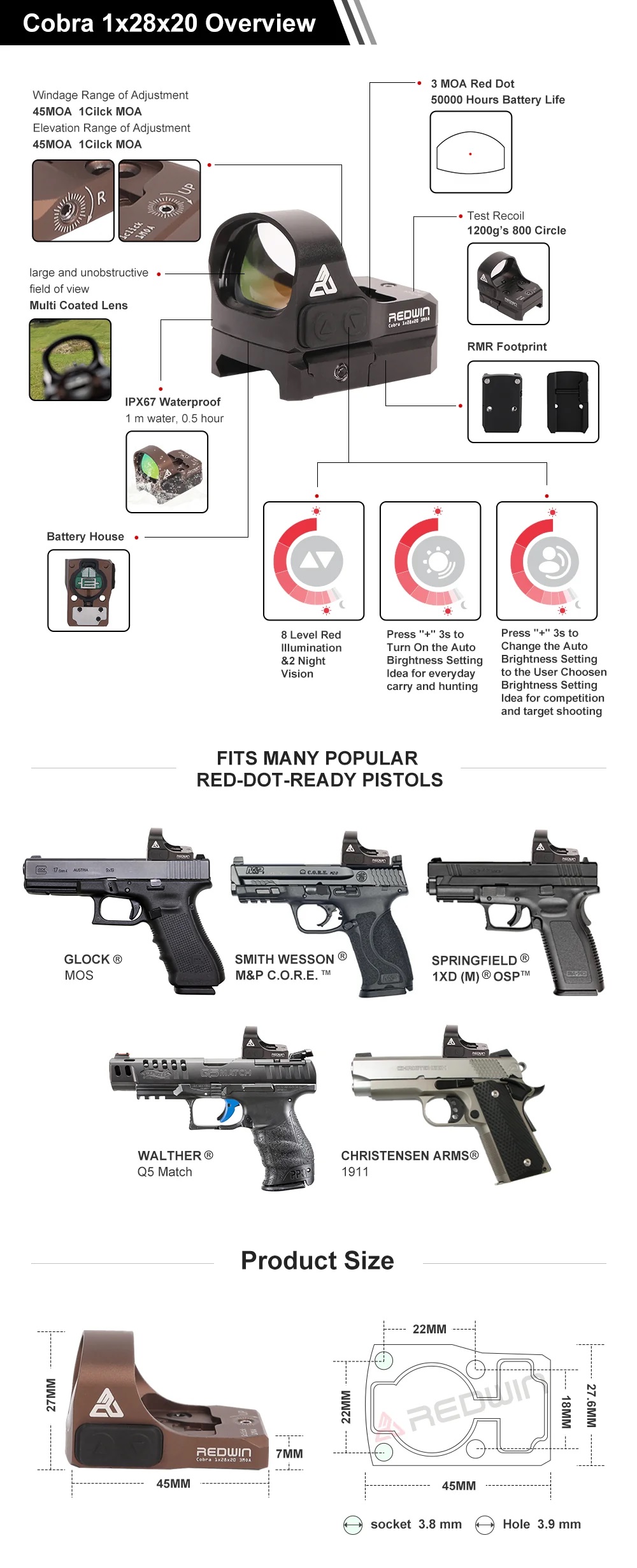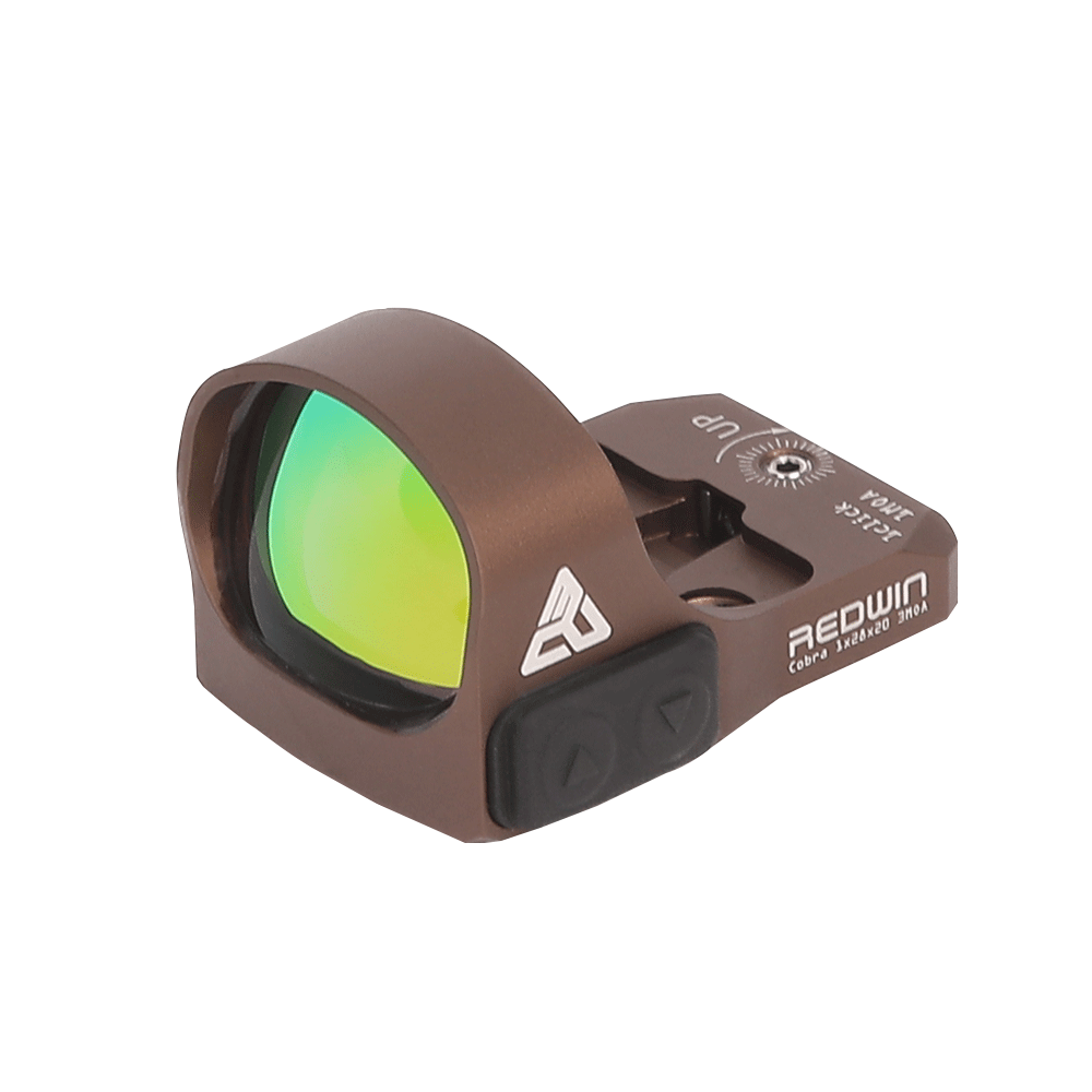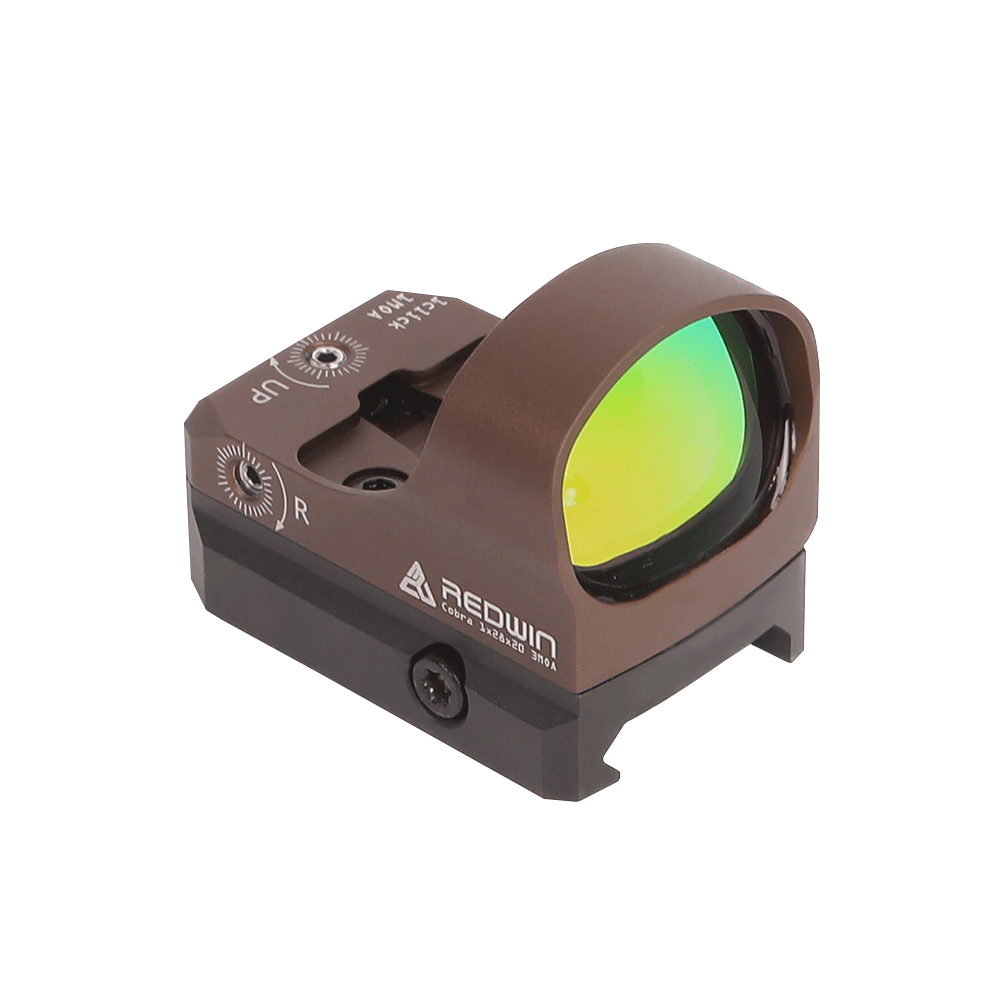 REDWIN COBRA 1X28X20 BRĄZOWA kolimator do montażu na płytce RMR, celownik dla pistoletów Canik (SFX mod2, Combat Elite i inne standardowe), S&W MP pasuje do płytek w zestawie z pistoletem.