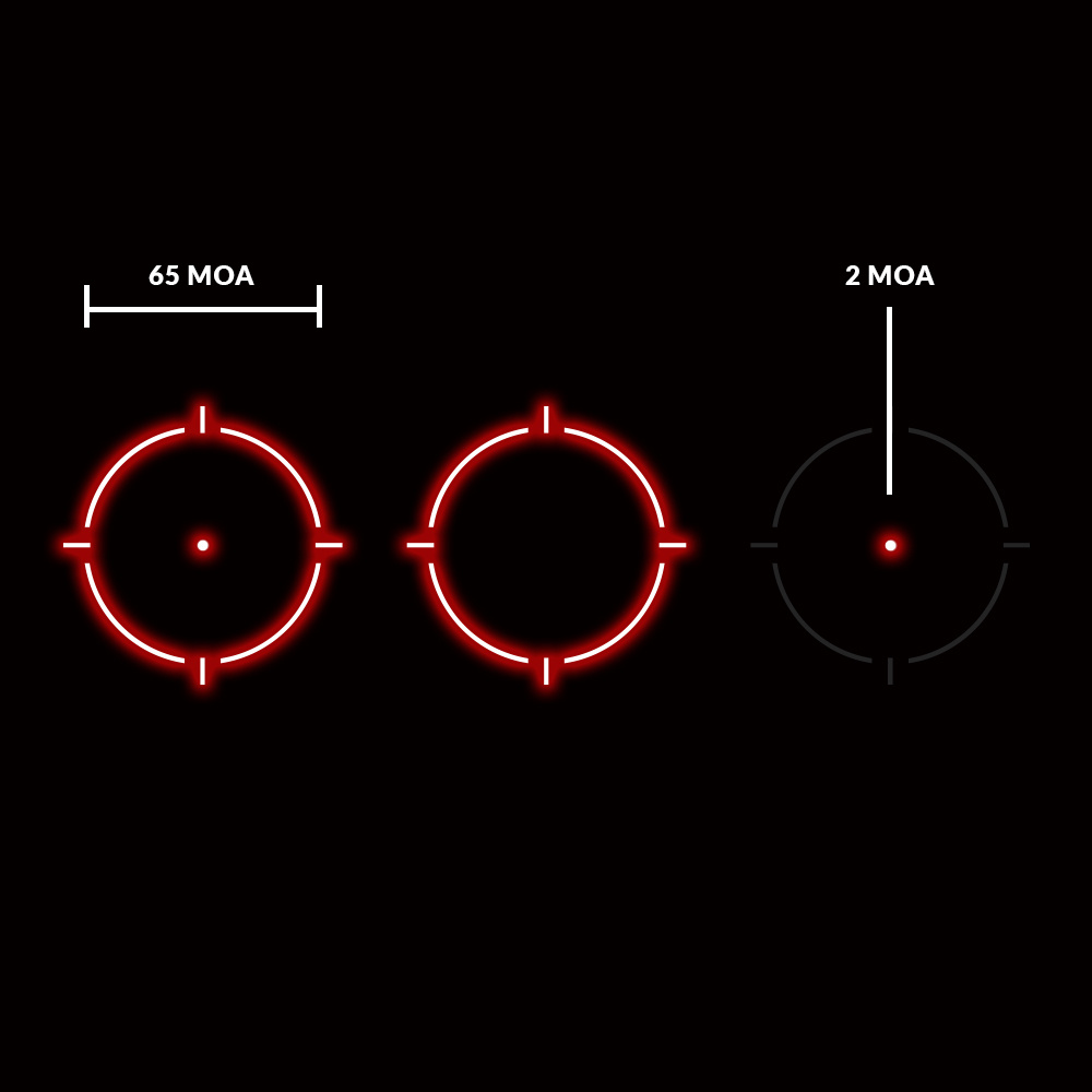 | Rozmiar punktów celowniczych | Kropka 2 MOA Okrąg 65 MOA |
