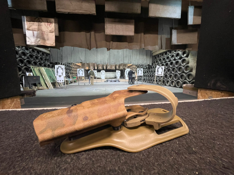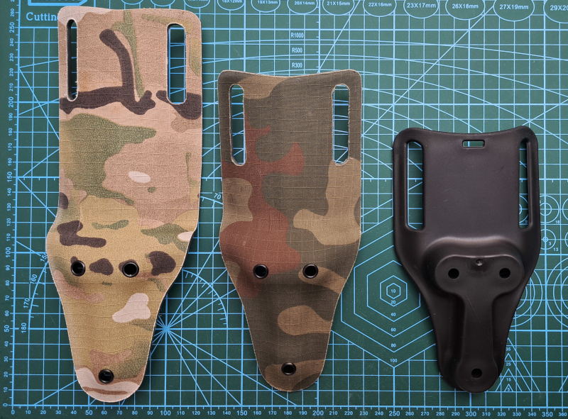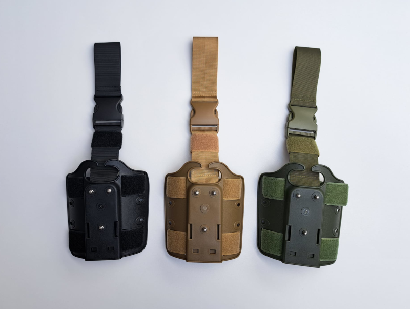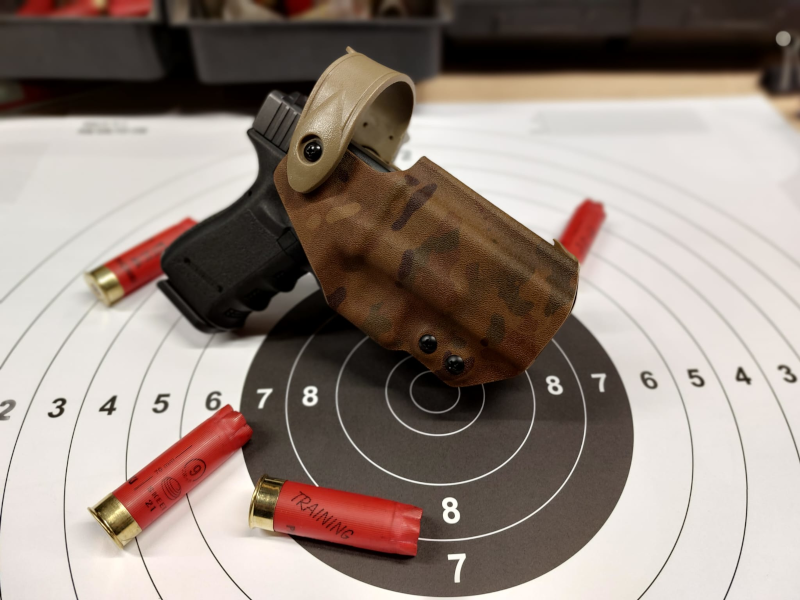 Typowa bojowa kabura zamontowana na obniżonym panelu. Wyprodukowana z amerykańskiego Kydexu. Posiada precyzyjną regulację siły docisku broni oraz system SLS, zapobiegający wypadnięciu broni.