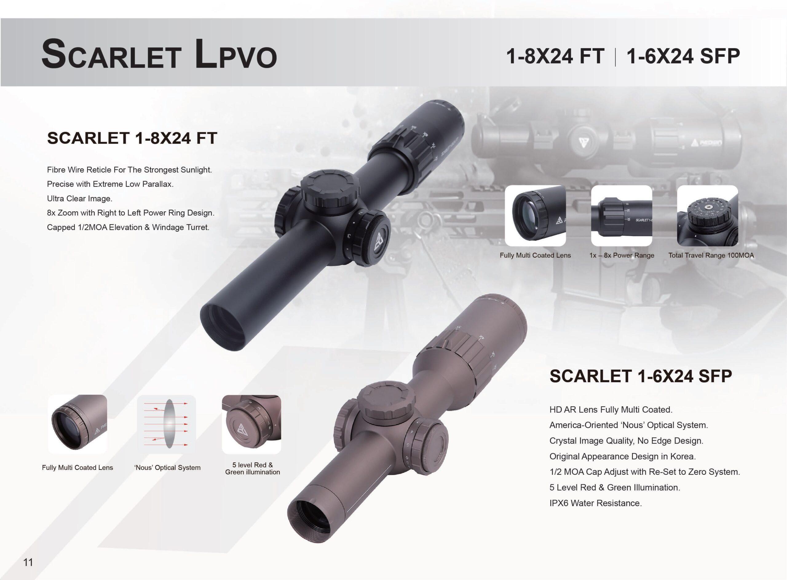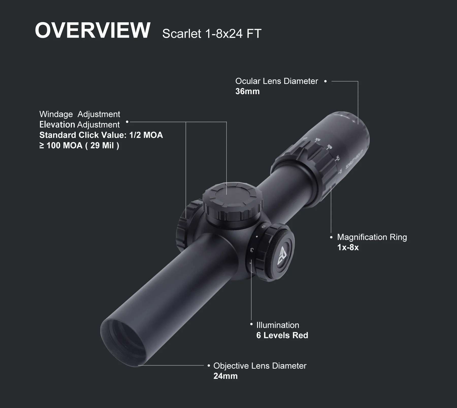 SCARLET 1-8×24 FT RW23 to zaawansowana luneta biegowa, przeznaczona do montażu na szynie picatinny, będąca doskonałym wyborem dla miłośników strzelectwa dynamicznego. Przy niskim powiększeniu umożliwia celowanie obuoczne, a większe przybliżenie ułatwia strzelanie na średnim dystansie.