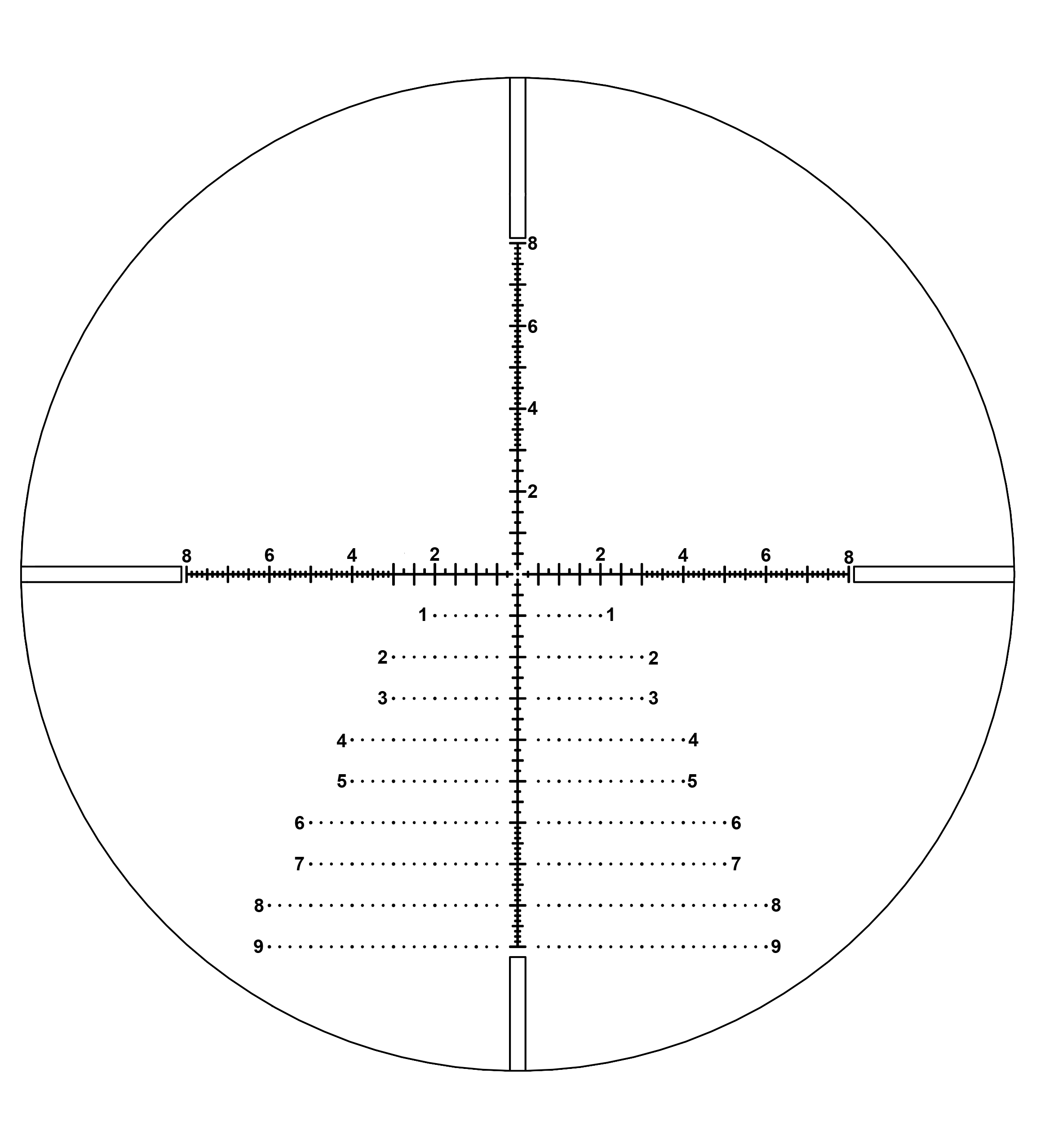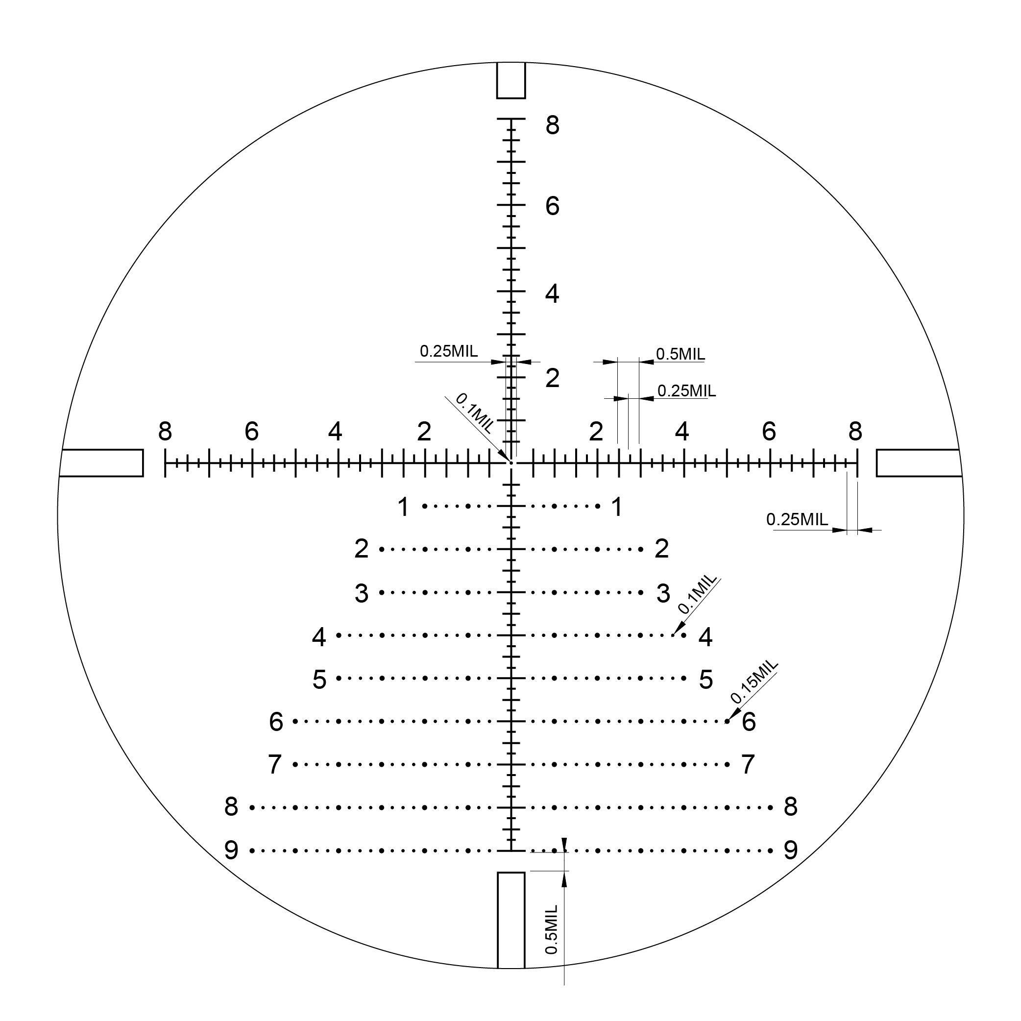– Taktyczna siatka celownicza FFP typu hash mil dot jest wygodna dla strzelca do pomiaru celu i obliczenia odległości. Dodatkowe kropki do kompensacji wiatru zapewniają dodatkowy punkt celowania podczas strzelania w innym środowisku