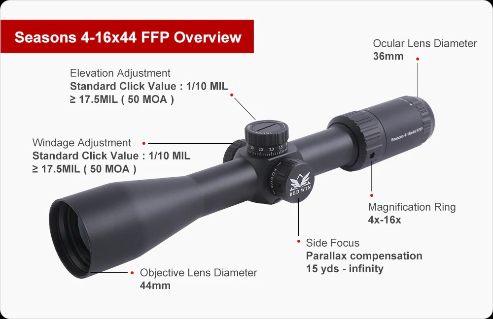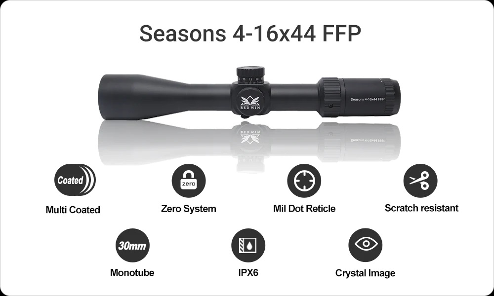 RED WIN Seasons 4-16X44 FFP luneta do montażu na szynie picatinny, celownik dla karabinów. System MAT-1 Zaprojektowany przez profesjonalnych strzelców, łączy pasywny dalmierz ze znacznikami MIL Dot do szacowania odległości do 17 miliradianów (mrad lub mils) na linii pionowej i 16 miliradianów na linii poziomej. Korzystanie z tego pasywnego dalmierza ze znaną balistyką broni umożliwia szybkie i celne strzały.
