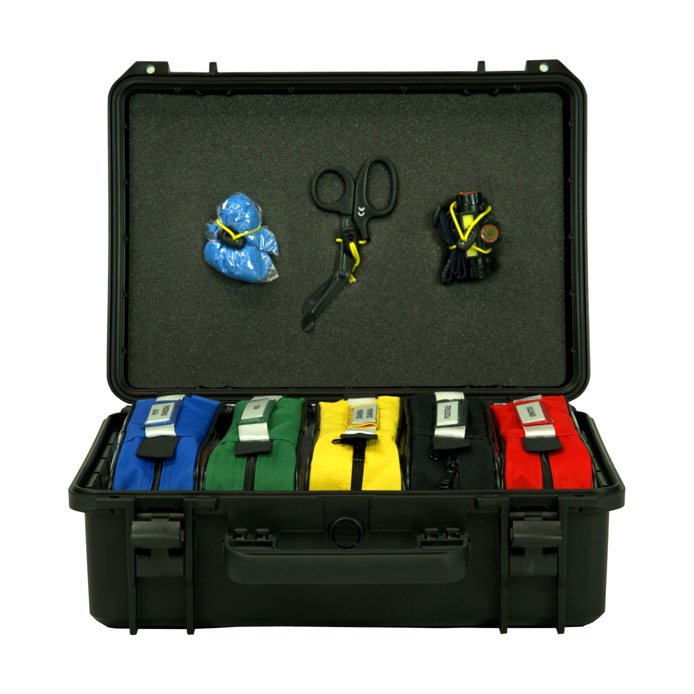 Każdy zestaw RESCUEbox umieszczono w ekstremalnie wytrzymałej walizce z atestem IP67, który gwarantuje wodoodporność w przypadku zanurzenia do 1 metra, a także ochronę przechowywanego wyposażenia przed kurzem i pyłem. Tworzywo, z którego wykonano kufer jest odporne na zginanie, naprężenie, udar mechaniczny, działanie związków chemicznych, a także wysokich i niskich temperatur. Szczelność zamknięcia gwarantują dwie solidne klamry zatrzaskowe o wzmocnionej konstrukcji. Na wyposażeniu każdej walizki znajduje się 5 saszetek segregacyjnych o wymiarach 8x13x26 cm w różnych wersjach kolorystycznych ułatwiających segregację sprzętu i podział na moduły. Każda z nich posiada przeźroczyste okienko, które pozwala na kontrolę zawartości bez otwierania oraz wygodne rączki, na których umieszczono miejsca na plakietki informujące o rodzaju wyposażenia. W saszetkach zastosowano niełamliwe i niezawodne zamki YKK.
